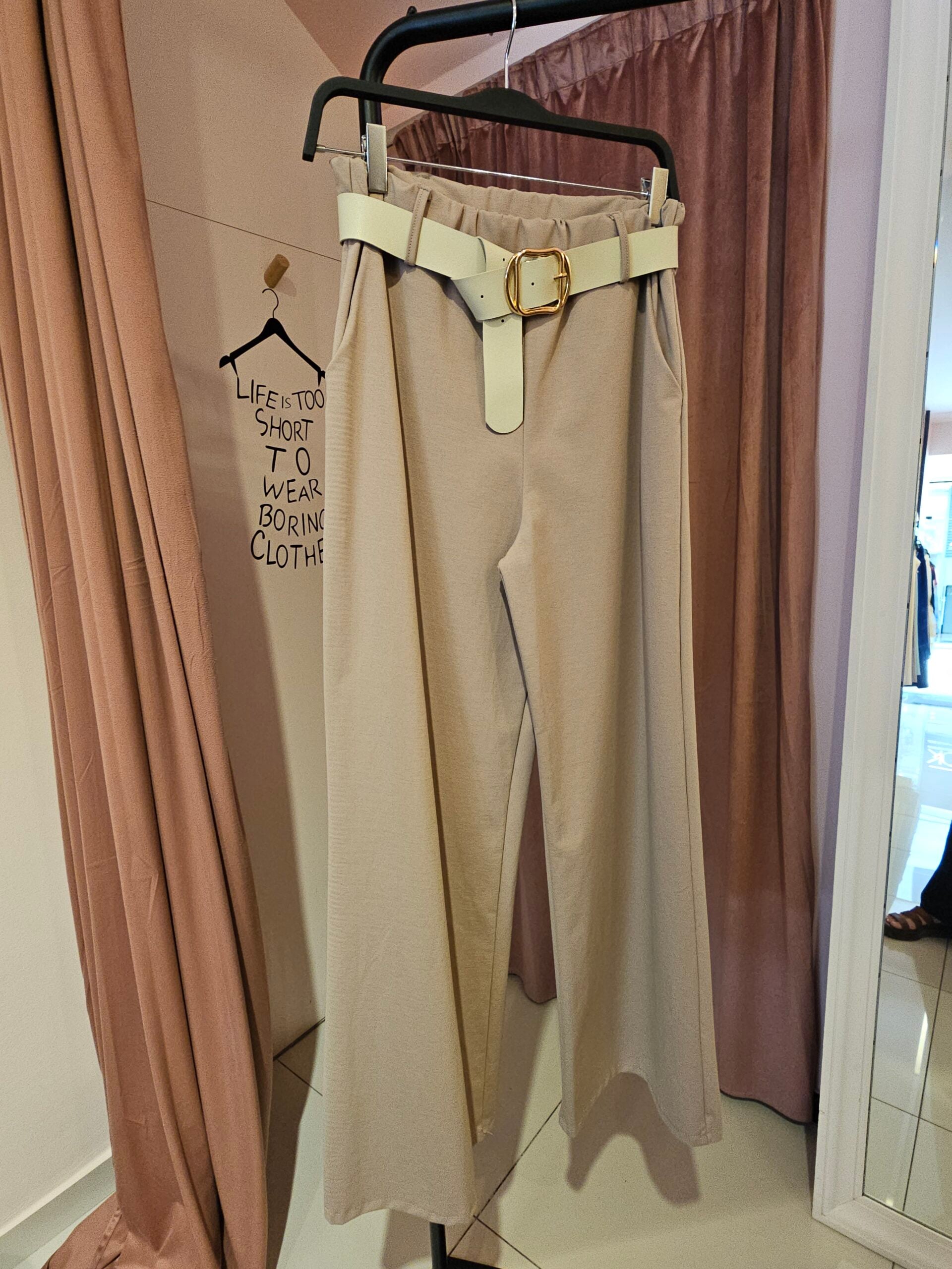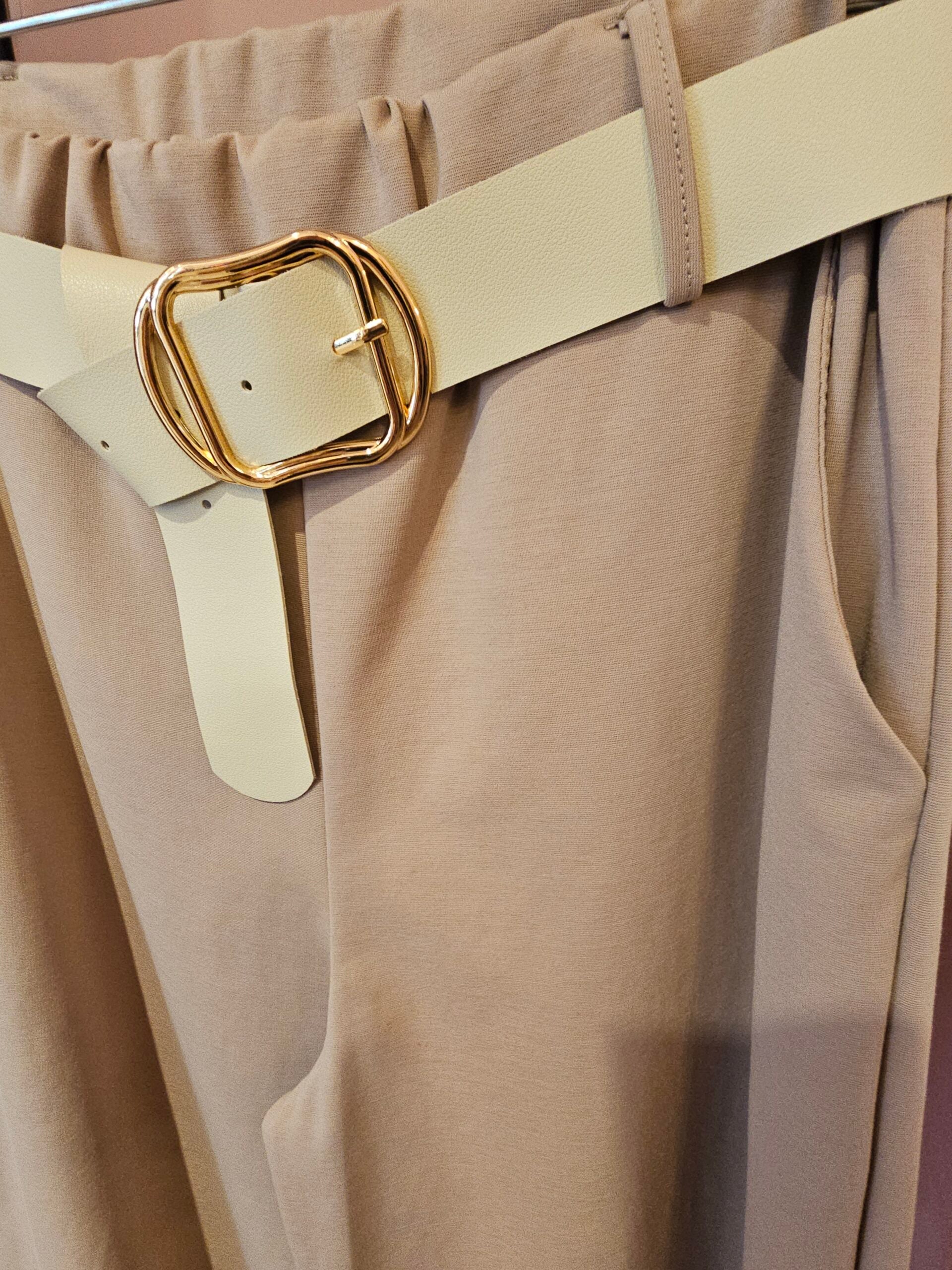 Θηλιές για ζώνη. Διαθέτει ζώνη δερμάτινη μπεζ με χρυσή αγκράφα.